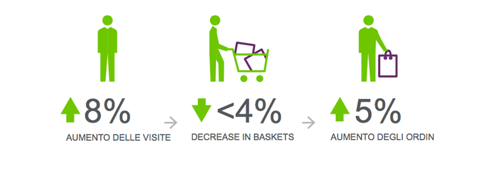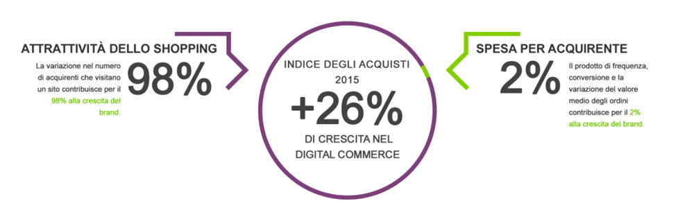 Negli ultimi tre mesi del 2015 il commercio digitale ha registrato un aumento del 26%: per quanto riguarda la crescita del brand, la variazione nel numero di acquirenti che hanno visitato un sito ha contribuito per il 98% (attrattiva), mentre il prodotto della frequenza, della conversione e del valore medio degli ordini per il 2% (spesa).