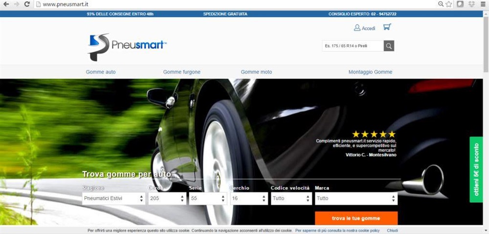 Pneusmart è una startup innovativa, con sede ad Amsterdam e Milano, che ha sviluppato l’e-commerce per scegliere e comprare gli pneumatici online. Fondata nel 2013 e presente in Olanda, Germania e Italia, Pneusmart offre un servizio innovativo per la vendita di gomme per auto, moto e furgoni, con spedizione gratuita entro 24 ore direttamente a casa o dal gommista partner convenzionato (oltre 2.000) più vicino all’utente, per un montaggio professionale e comodo. La piattaforma è dotata di una tecnologia proprietaria particolarmente evoluta, che permette di scegliere il miglior prodotto in qualunque momento, in tutta Europa e al miglior prezzo. Su www.pneusmart.it sono presenti oltre 10 milioni di pneumatici, 40 brand, più di 2000 rivenditori e partner di montaggio e 10.000 utenti attivi. Il catalogo di Pneusmart è molto ampio: oltre 20.000 prodotti, tra cui molti pneumatici specializzati e difficili da trovare che possono essere ordinati e acquistati dai gommisti e dai clienti.