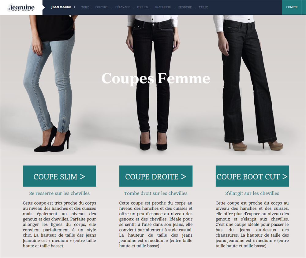 Jeanuine (jeanuine.com), un e-commerce fondato nel 2014 ad Hong Kong, ha realizzato un’esperienza d’acquisto semplice, veloce e fresca, offrendo al cliente la possibilità di personalizzare facilmente il jeans perfetto ed unico per ciascun consumatore.