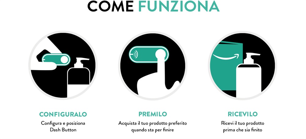 Quando il cliente imposta Dash Button, non deve fare altro che collegare il tasto Dash al Wi-Fi e utilizzare l'applicazione Amazon sul proprio smartphone per selezionare il prodotto da ordinare nuovamente. Con il pulsante Dash, i clienti beneficiano degli stessi prezzi bassi di Amazon.it e ricevono i prodotti con le spedizioni Prime illimitate, senza costi aggiuntivi. Nel momento in cui viene effettuato un ordine, i clienti ricevono sullo smartphone una notifica di conferma del prodotto, con la data di consegna e il prezzo. Come avviene con gli acquisti effettuati con 1-Click di Amazon, i clienti hanno il tempo di rivedere, modificare o cancellare l’ordine in modo semplice. Dash Button viene dotato di un adesivo riutilizzabile e un gancio estraibile per appenderlo, incollarlo o posizionarlo in qualunque luogo il cliente desideri.
