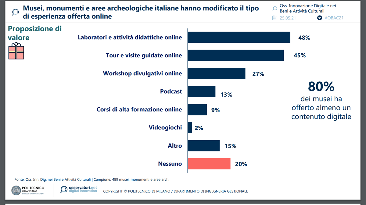 L’80% dei musei italiani ha offerto almeno un contenuto online durante i mesi di chiusura, come laboratori o tour guidati virtuali