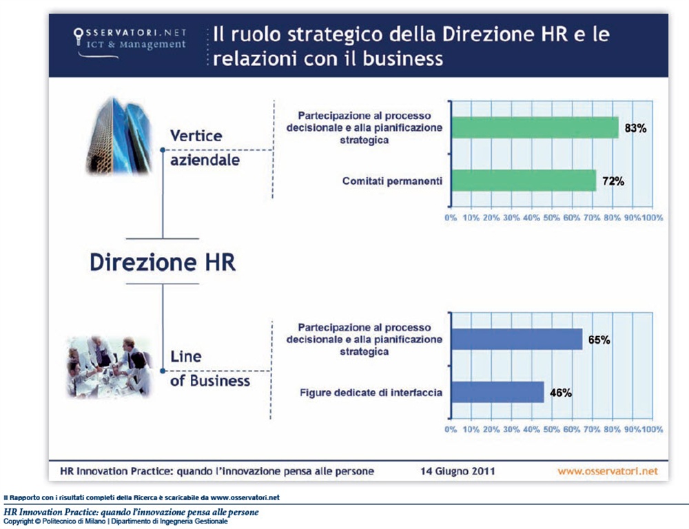“Sempre più il Vertice Aziendale e le Line of Business chiedono alle loro Direzioni HR di abbandonare il ruolo di meri amministratori per assumere quello di “business partner” a supporto del management – afferma Mariano Corso, Responsabile Scientifico dell’Osservatorio HR Innovation Practice - poiché la motivazione, il coinvolgimento e lo sviluppo delle persone e dei loro talenti in un’ottica di lungo periodo sono gli unici fattori in grado di apportare reali vantaggi competitivi”.