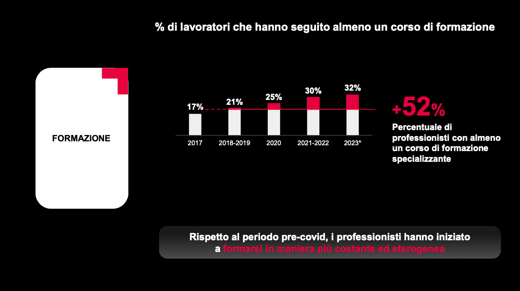 Un mercato in forte evoluzione: per questo la formazione giocherà un ruolo cruciale. Sempre dall’indagine, emerge che nel 2022 è cresciuto di oltre il 50% il numero di professionisti che hanno seguito almeno un corso di formazione. Nel complesso si registra uno tsnunami che coinvolge in particolar modo i giovani: rispetto al periodo pre-Covid i profili junior cambiano lavoro con una frequenza due volte superiore, tanto che l’83% dei giovani professionisti lascia la propria mansione anche prima dei due anni. Le aziende, inoltre, faticano ad assumere profili di questo tipo: nonostante il 47% delle offerte si rivolga a junior, ne viene assunto solo il 10%, con le assunzioni che finiscono con il privilegiare figure più senior, già con competenze. L’82% dei dipendenti ritiene importante la riqualificazione ed il miglioramento delle proprie competenze ma una persona su due si ritiene insoddisfatta, perché priva di un’adeguata offerta formativa.