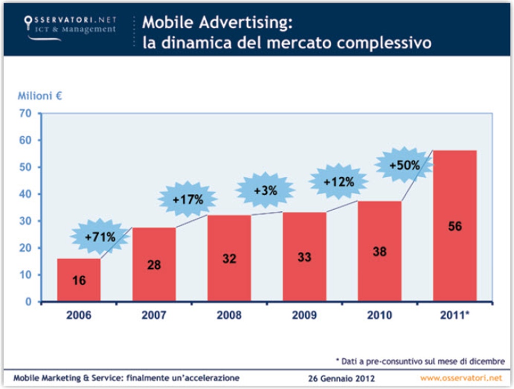 Il mercato del Mobile Advertising, ossia gli investimenti delle aziende in spazi pubblicitari sul canale Mobile, è infatti cresciuto del 50%, passando da 38 a 56 milioni di euro, pari a circa il 5% del totale mercato Advertising su Internet. Questa evoluzione del mercato apre importanti prospettive sui prossimi anni: ci si aspetta, infatti, che il Mobile entro 2 anni possa superare la quota del 10% del totale degli investimenti pubblicitari su Internet.