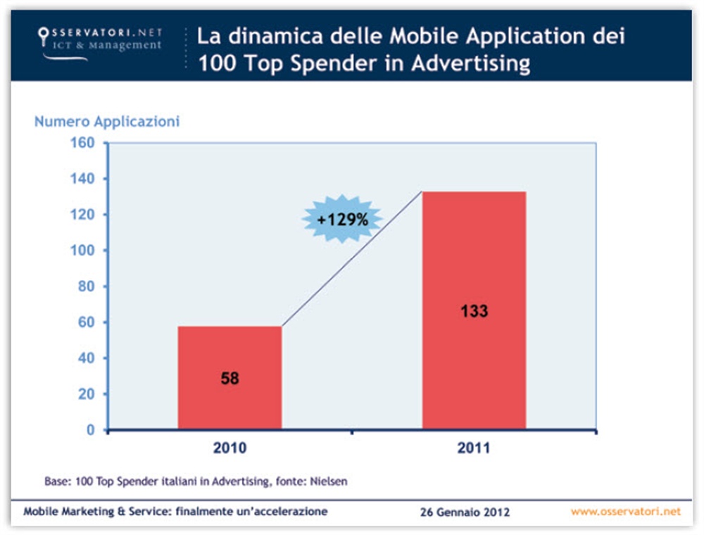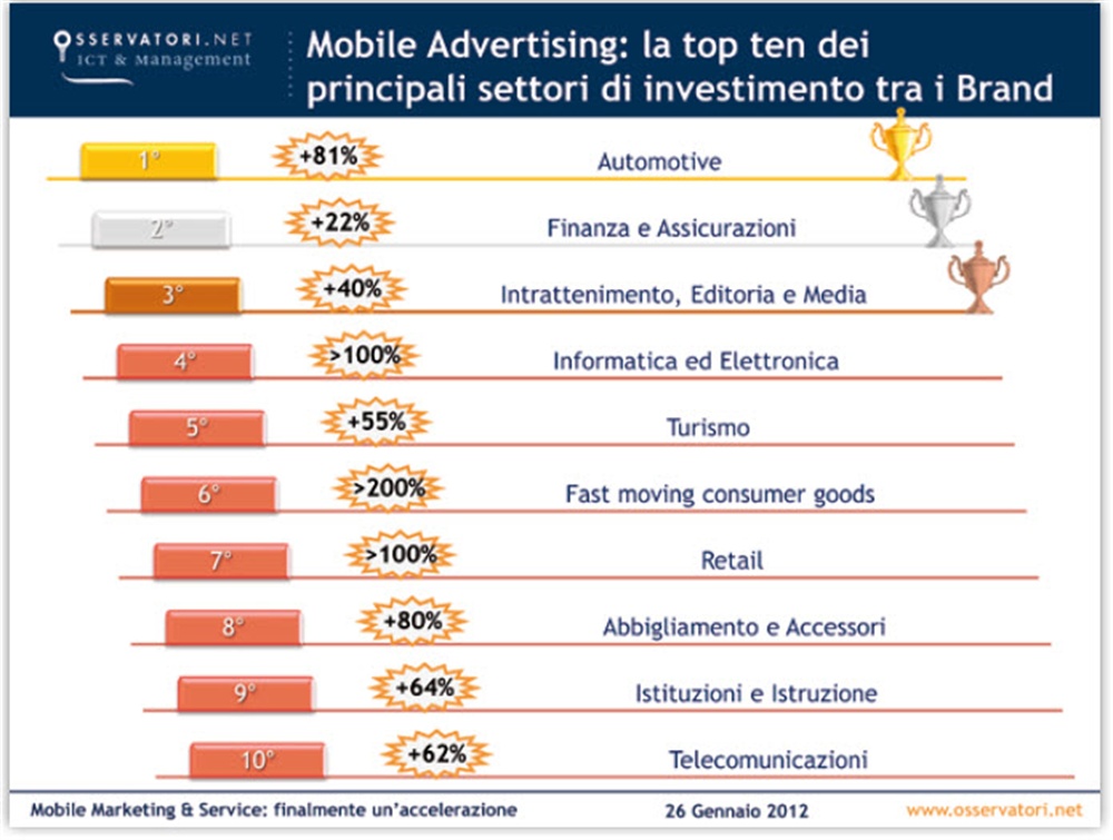 Nel 2011 quasi la metà dei 100 top spender italiani in advertising ha sviluppato almeno un’applicazione Mobile. Il Mobile Advertising è cresciuto del 50%, passando da 38 a 56 milioni di euro, pari al 5% del totale mercato ADV su Internet. Entro 2 anni previsto il sorpasso della quota 10%. Spicca, in crescita dell’81%, il settore dell’automotive, che scalza banche-finanza-assicurazioni