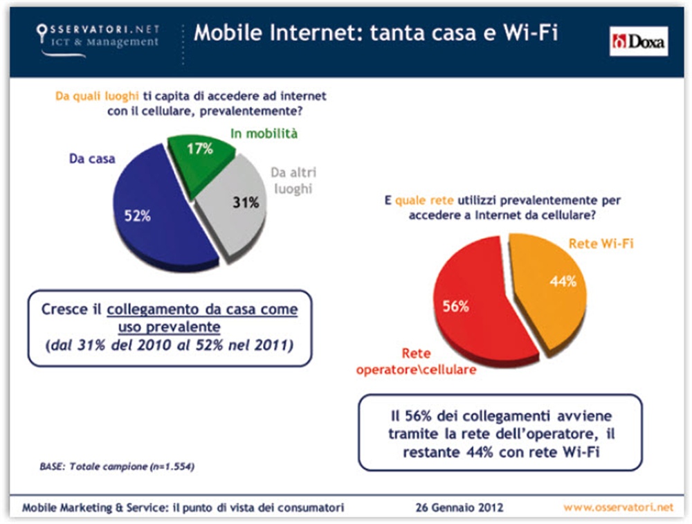 Per quanto riguarda invece le MODALITÀ DI FRUIZIONE del mezzo, una indagine quantitativa condotta dall’Osservatorio in collaborazione con Doxa evidenzia inoltre come il 50% degli utenti navighi già tutti i giorni e che si navighi mediamente 45 minuti al giorno. Oltre il 50% lo fa principalmente da casa (in crescita vertiginosa rispetto al dato del 31% del 2010) e il 16% da scuola o dall’ufficio; solo il 17% in mobilità. Il 44% usa prevalentemente reti Wi-fi, percentuale che sale al 63% se si considerano solo i giovanissimi (16-24 anni) e il  56% dichiara di dare il consenso a servizi di Geolocalizzazione (prevalentemente tramite motori di ricerca, mappe, servizi meteo e social network).