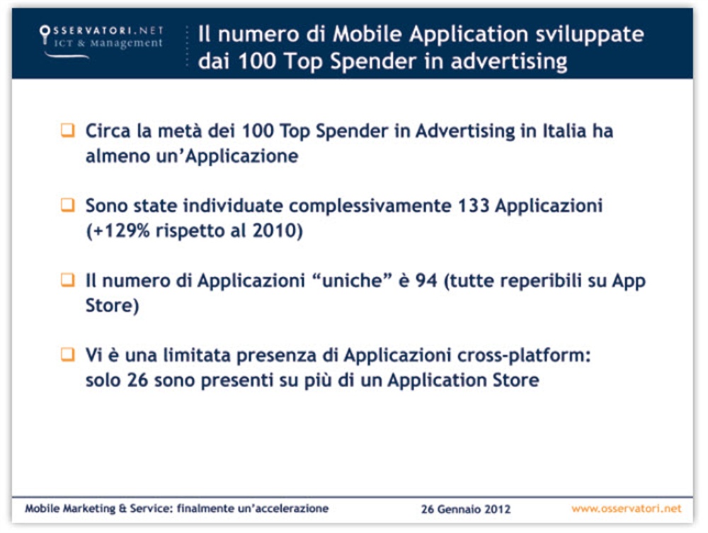 Parallelamente nel corso del 2011 si è registrato un boom di MOBILE APPLICATION sviluppate dalle aziende italiane. Tra i 100 Top Spender nel 2011 in Advertising sono state individuate 133 Applicazioni, con un trend di crescita sull’anno precedente del +129%. Sono circa la metà i Top Spender che hanno almeno un’Applicazione e 94 le App “uniche” (ossia il numero di App conteggiate una sola volta su più Store). L’Application Store più gettonato si riconferma quello di Apple. Tra i principali obiettivi nello sviluppo di una App si registra che oltre il 60% punta a un maggior engagement con la marca (ovvero cerca di far trascorrere all’utente più tempo a contatto con il brand, ad esempio tramite i giochi); quasi il 50% intende aumentare il livello del servizio con servizi di pre- o post- vendita; oltre il 30% ha obiettivi tangibili di lead generation; solo il 9% mira al puro branding.