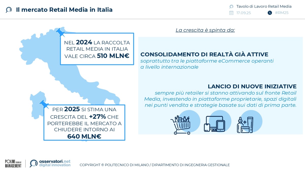 Milano, 17 settembre 2025 – Il Retail Media si afferma come uno dei trend più rilevanti all’incrocio tra pubblicità e commercio, perché cambia il modo in cui il modo in cui brand e retailer dialogano con i consumatori. In Italia nel 2024 la raccolta pubblicitaria Retail Media ha raggiunto circa 510 milioni di euro, mentre nel 2025 sarà intorno ai 640 milioni di euro, grazie a una crescita attesa del +27%. La spinta arriva dal consolidamento dei grandi operatori eCommerce e dalle nuove iniziative lanciate negli ultimi anni, sono sempre più i retailer – in particolare nei comparti del Food&Grocery, dell’Informatica ed elettronica e del Beauty&Pharma – che investono in piattaforme proprietarie, spazi digitali nei punti vendita e strategie basate su dati di prima parte.