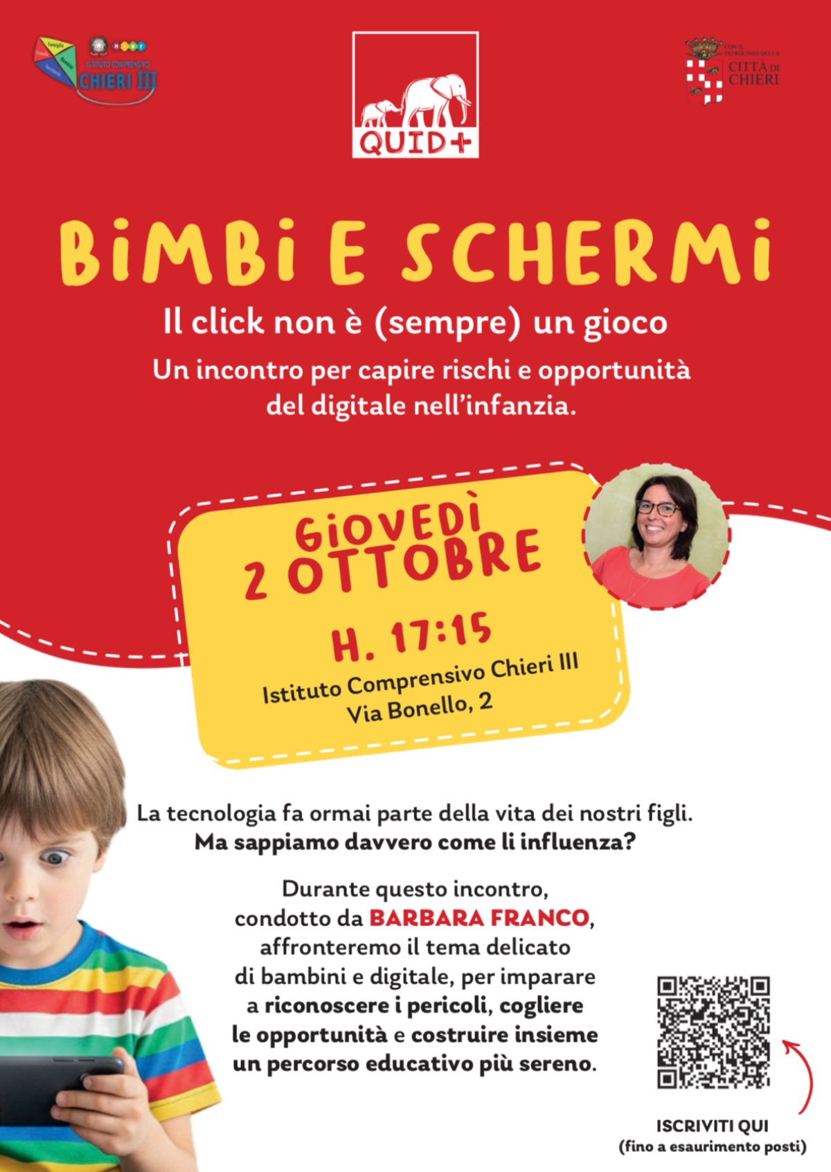 Milano, 23 settembre 2025 - Giovedì 2 ottobre 2025, alle 17:15 presso l’arena dell’Istituto Comprensivo Chieri III, si terrà un incontro formativo dal titolo “Bimbi e schermi: Il click non è (sempre) un gioco | Un incontro per capire rischi e opportunità del digitale nell’infanzia.”, aperto ai genitori degli alunni della scuola dell'infanzia e delle classi prime e seconde della scuola primaria dell’istituto.