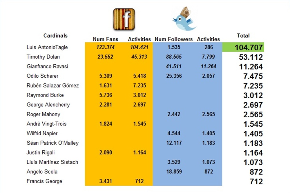 Luis Antonio Tagle, Arcivescovo di Manila e tra i più giovani cardinali con solo 55 anni, è il porporato con il maggior numero diattività sui social media: ben 104.707, il 53% di quelle totali, ottenute soprattutto grazie al grande seguito su Facebook della sua pagina dedicata alla trasmissione televisiva in cui commenta le letture.