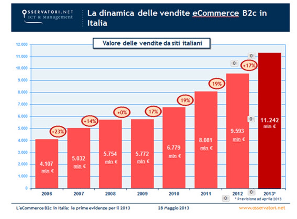 La previsione di crescita delle vendite dai siti italiani per tutto il 2013, secondo l’Osservatorio eCommerce B2c Netcomm–School of Management del Politecnico di Milano, si attesta intorno al 17%, per un fatturato stimato intorno ai 11,2 miliardi di euro. Fra i principali comparti sono in crescita rispetto al 2012: l’abbigliamento (27%), l’informatica (24%), il grocery (18%), il turismo (13%), le assicurazioni (12%), l’editoria (4%).