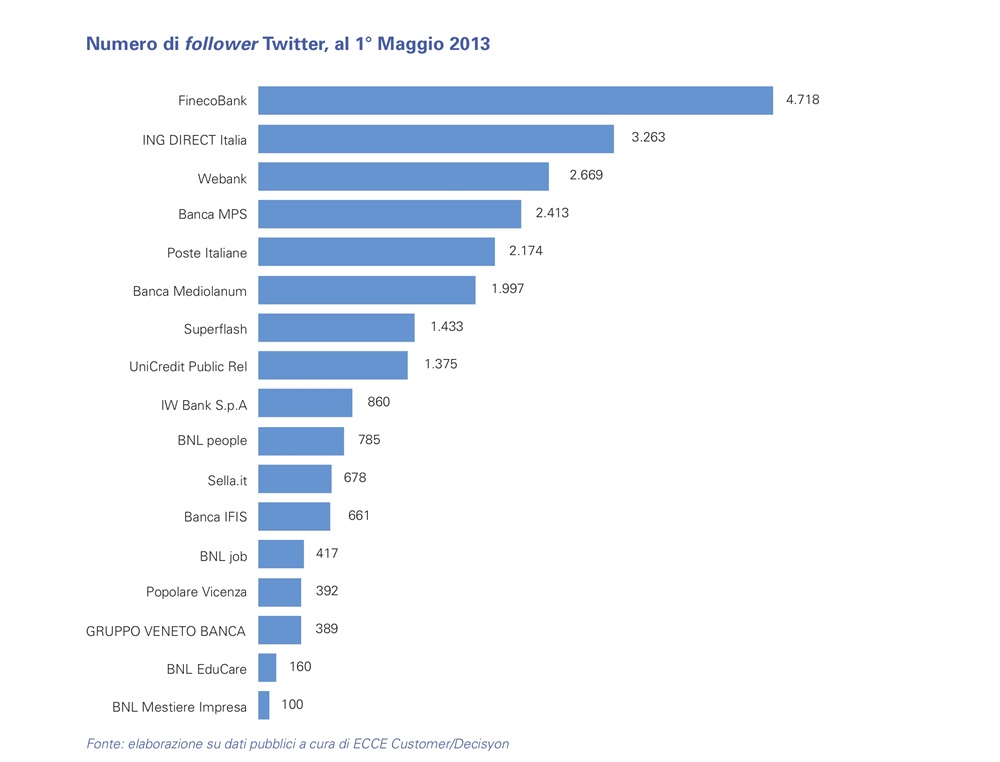 FinecoBank ottiene così il primo posto con 4.718 follower, seguita da ING DIRECT Italia con 3.263 e Webank, che si classifica terza con 2.669 follower.