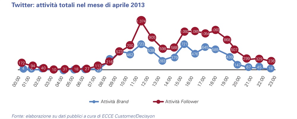 Anche gli utenti iniziano a essere attivi a partire dalle 8.00 arrivando poi a toccare un picco assoluto di 1374 attività alle 11.00 e mantenendosi poi costantemente sopra le 1000 attività tra le 15.00 e le18.00. Da segnalare che su Twitter, però, le attività dei clienti proseguono ben oltre il normale orario lavorativo, mantenendo un livello superiore alle 200 attività fino alle 23.00.