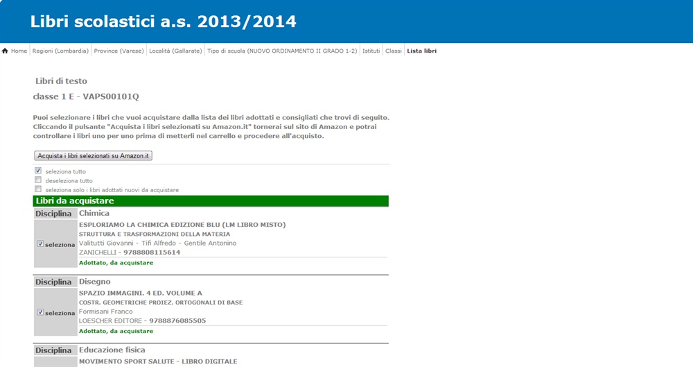 Sul sito sono presenti le adozioni di tutte le classi delle scuole medie inferiori e superiori che hanno confermato i dati per l’anno scolastico 2013-2014. Selezionando la classe e la sezione di interesse appare la lista dei testi, con l’indicazione su quali sono adottati o consigliati per la specifica classe.