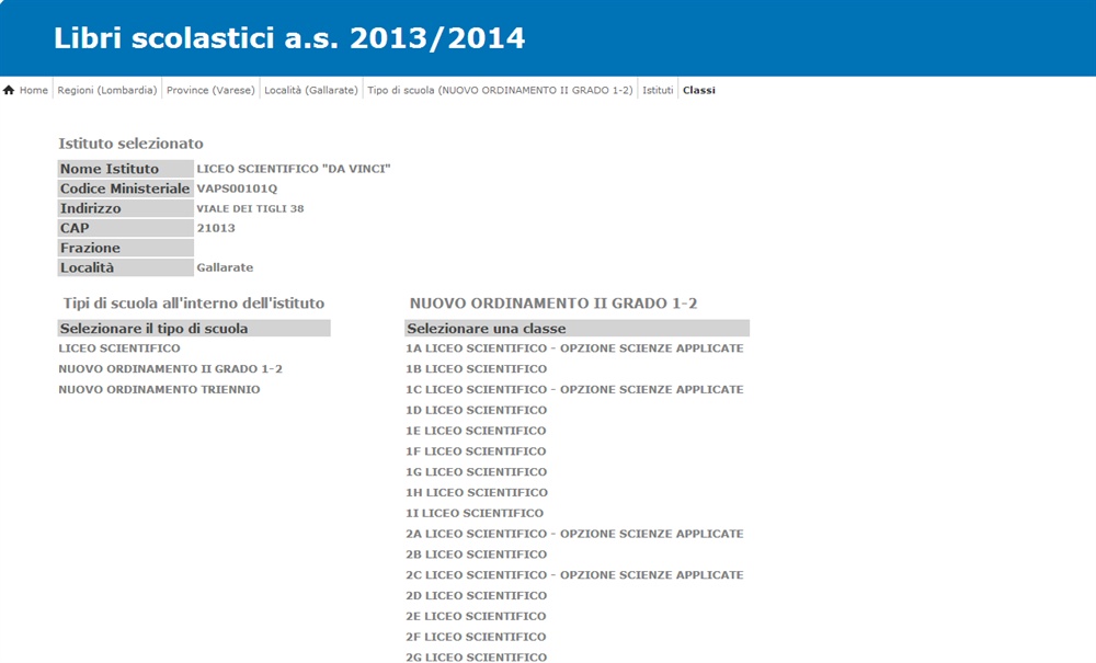 Accedere al servizio è molto semplice: il database è consultabile per area geografica, selezionando progressivamente regione, provincia, comune, istituto, classe e sezione.