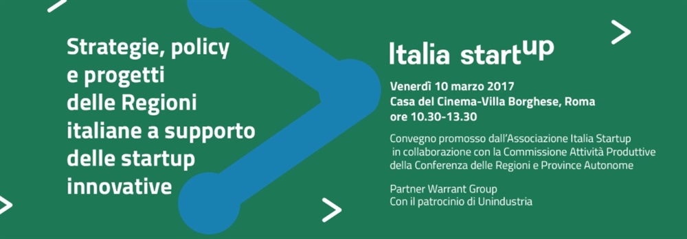 Italia Startup ti invita a partecipare al Convegno "Strategie, policy e progetti delle Regioni italiane a supporto delle startup innovative" promosso dall’Associazione delle startup italiane, in collaborazione con la Commissione Attività Produttive della Conferenza delle Regioni e Province Autonome, in partnership con l'azienda associata Warrant Group e con il patrocinio di Unindustria, che si terrà venerdì 10 Marzo, dalle ore 10.30 alle ore 13.30, a Roma presso la Casa del Cinema (Villa Borghese), Largo Marcello Mastroianni.
