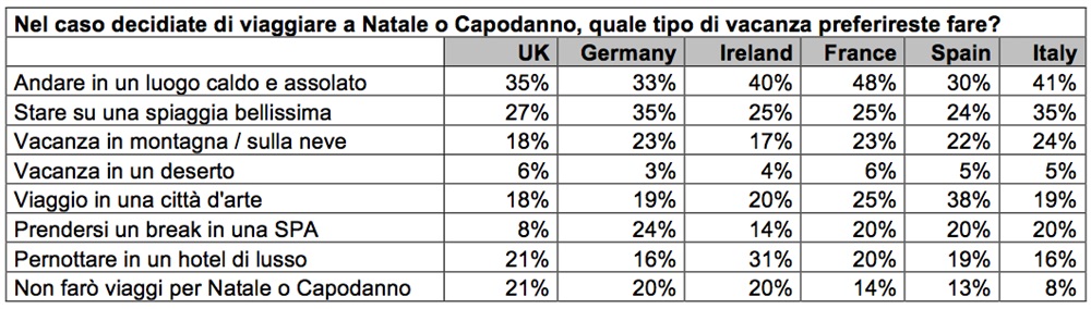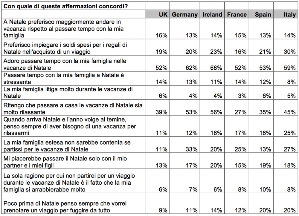 Dalla survey emerge come quasi due italiani su tre preferiscono passare Natale con la propria famiglia e il 45% trova rilassante passarlo a casa; tuttavia un italiano su tre vorrebbe usare i soldi dei regali di Natale per farsi una vacanza: in questo caso le spiagge, preferite dal 41% degli italiani, battono le piste da sci, sognate dal 35%.