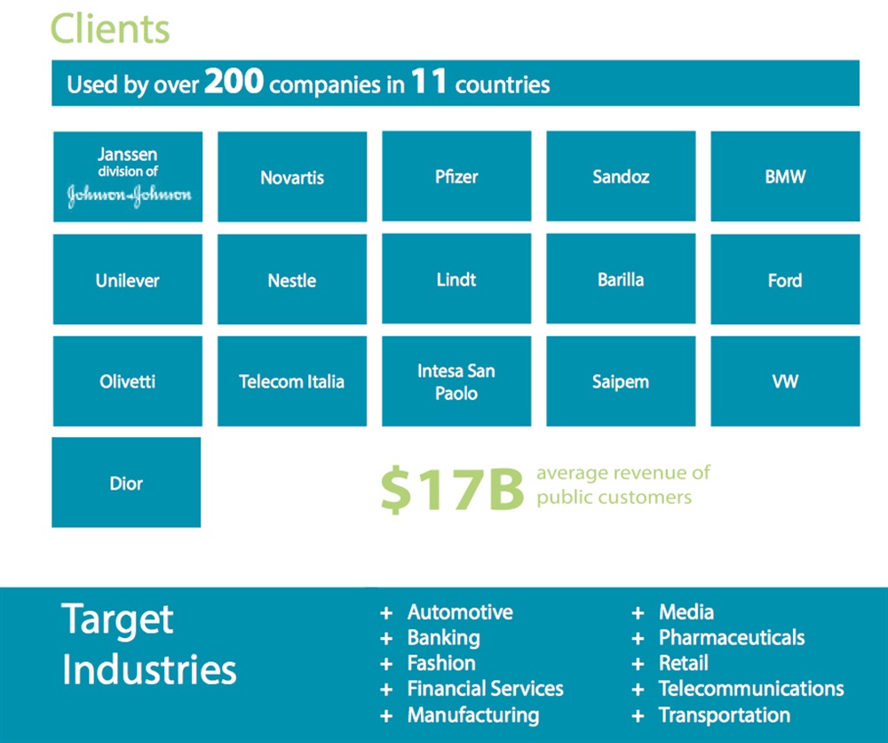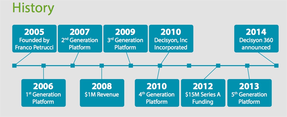 Fondata in Italia nel 2005, la piattaforma Decisyon è ora utilizzata da più di 200 aziende a livello globale, tra cui aziende dei settori farmaceutico, finanziario, banking, media, fashion, manifatturiero, retail, trasporti, telecomunicazioni e automotive.
