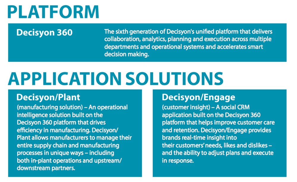 “La piattaforma Decisyon 360 consente ai clienti e ai partner di creare velocemente soluzioni data-driven che migliorano l’efficacia dei processi operativi, forniscono una misura delle nuove opportunità di profitto e incrementano sensibilmente la velocità di innovazione. E tutto questo in una frazione del tempo e del costo richiesto alla moltiplicazione dei prodotti e dalla codificazione customizzata tipica dei precedenti approcci. Unendo analisi, pianificazione, collaborazione ed esecuzione in un’unica piattaforma, Decisyon è entrata in modo efficace nella business intelligence dei processi operativi e nella pianificazione; nell’innovazione dei processi di produzione; nel social CRM e nello sviluppo di applicazioni commerciali.”