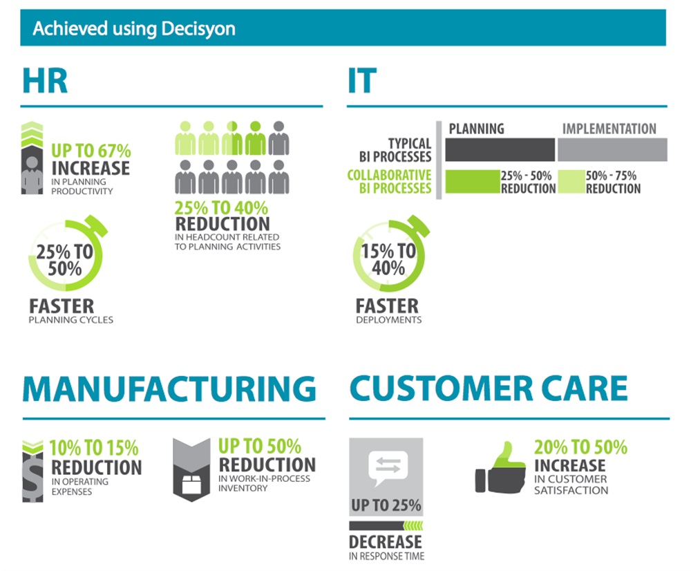 Allo stesso modo, i fornitori di singole soluzioni soffrono la mancanza dell’ampiezza di funzioni (collaborazione, business intelligence, pianificazione) e richiedono ulteriori acquisti e sforzi di integrazione. Dato che Decisyon 360 è stata costruita come un’unica piattaforma sin dalla sua origine, le soluzioni in essa incluse possono essere implementate in una frazione del tempo e con un una frazione del costo richiesti dai precedenti approcci, che comportavano l’acquisto di molti prodotti e una codificazione su misura.