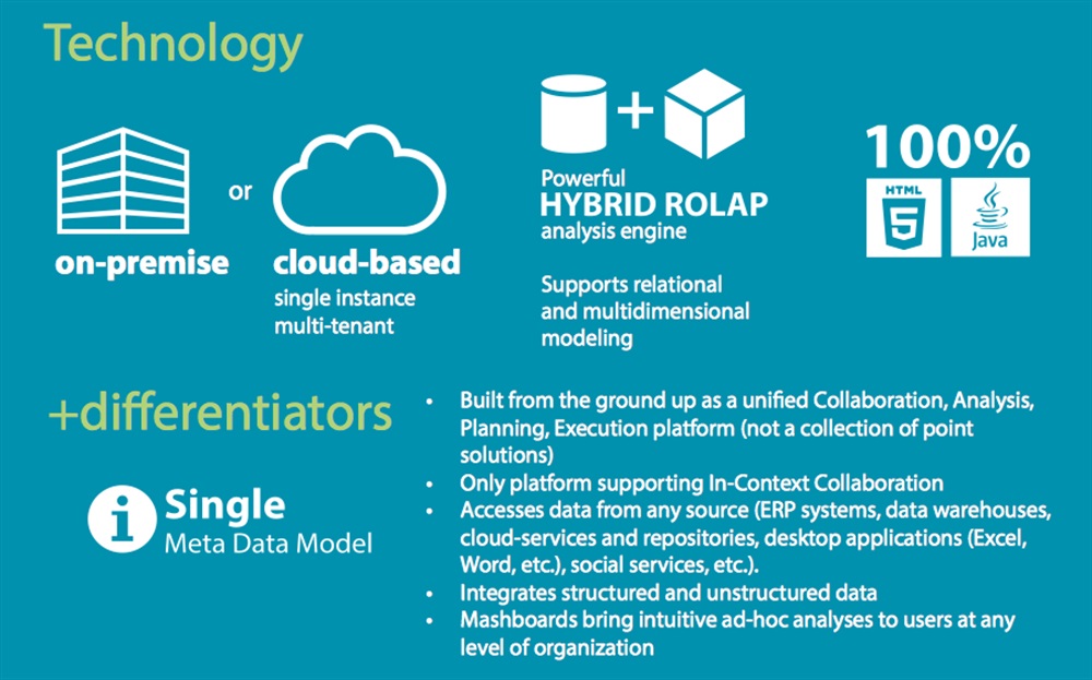 • permettere ai manager di collaborare, analizzare, programmare ed eseguire transazioni e processi in tempo reale, attraverso l’integrazione diretta con i sistemi di gestione dei processi operativi e con i flussi di lavoro;