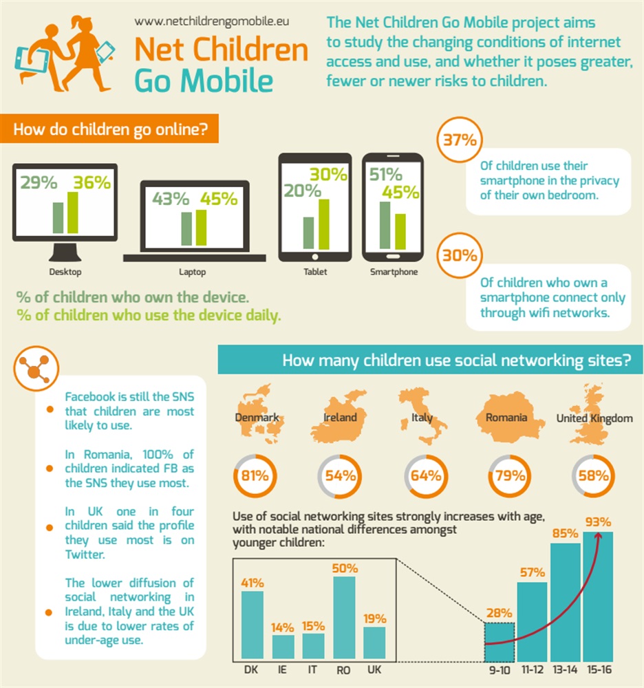 Il 51% dei ragazzi di 9-16 anni utenti di internet in Danimarca, Irlanda, Italia, Regno Unito e Romania possiede uno smartphone e il 45% lo usa quotidianamente per andare online; il 20% possiede un tablet, ma il 30% usa un tablet ogni giorno per accedere a internet. Ma le differenze fra paesi sono ancora notevoli: In Italia il 45% dei ragazzi che usano internet ha uno smartphone, e il 42% accede alla rete quotidianamente dal cellulare.