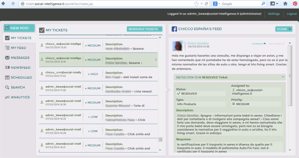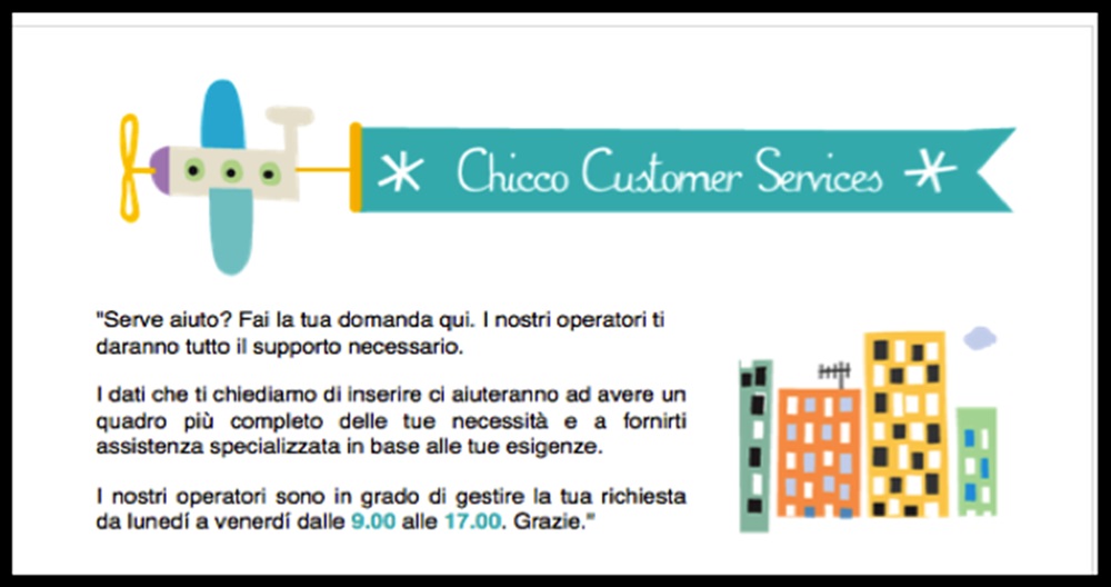 - Le richieste più semplici o relative a un’informazione specifica (per esempio la disponibilità di un ricambio per un passeggino, o la comunicazione dei dati relativa ad iniziative benefiche alle quali Chicco si cura sempre di rispondere) vengono gestite immediatamente tra Community Manager e Customer Service locali senza il coinvolgimento della struttura di Customer Service centrale pur consentendo a questa di monitorare e verificare il processo.