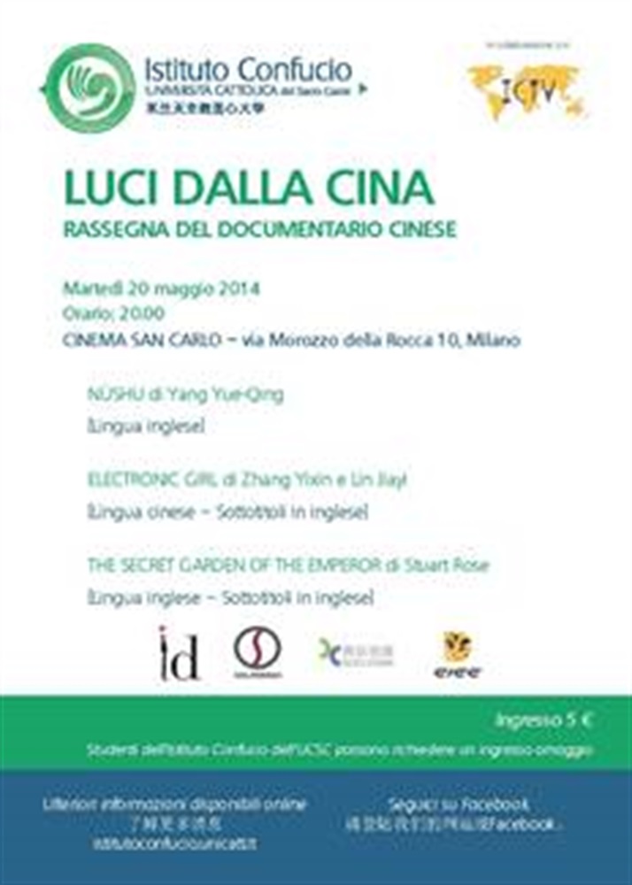 Dalle aule universitarie ci si sposta invece al cinema nella serata del 20 maggio (cinema San Carlo, a partire dalle ore 20) per la rassegna del documentario cinese “Luci dalla Cina”, la tappa milanese di “Les Ecrans de Chine”, manifestazione nata a Parigi nel 2009 su iniziativa del regista, produttore e distributore cinematografico francese Michel Noll. Protagonisti della Rassegna sono autori indipendenti cinesi, che con le loro storie e sguardi, ci presentano la realtà della “Nuova Cina”, un paese che sta vivendo profonde trasformazioni sociali ed economiche, la cui portata è di dimensioni epocali e ancora tutta da scoprire. La serata prevede la proiezioni di tre documentari: “Nushu: a hidden language of women of China” ripercorre la nascita di un particolare linguaggio scritto, sviluppato da alcune donne contadine, che permise loro di esprimere liberamente se stesse e la propria sofferenza nella Cina feudale che le considerava esseri inferiori; “Electronic girl” ripercorre il sogno di Wang Mao, una ragazza che nonostante la malattia riuscì ad organizzare il primo festival in Cina di musica elettronica; e infine “The secret garden of the emperor”, un film che dipinge fedelmente il progetto di restauro del Juanqinzhai, giardino e teatro privato della dinastia Qing. L’ingresso sarà grauito per gli studenti dell’Istituto Confucio dell’Università Cattolica e disponibile al costo ridotto di 5€ per  tutti coloro che vorranno accedere all’evento.