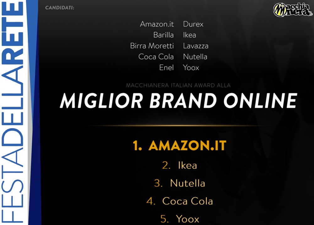 Tra i candidati alla categoria Miglior brand online figuravano, oltre ad Amazon, prestigiosi brand come Barilla, Birra Moretti, Coca Cola, Enel, Durex, Ikea, Lavazza, Nutella e Yoox.