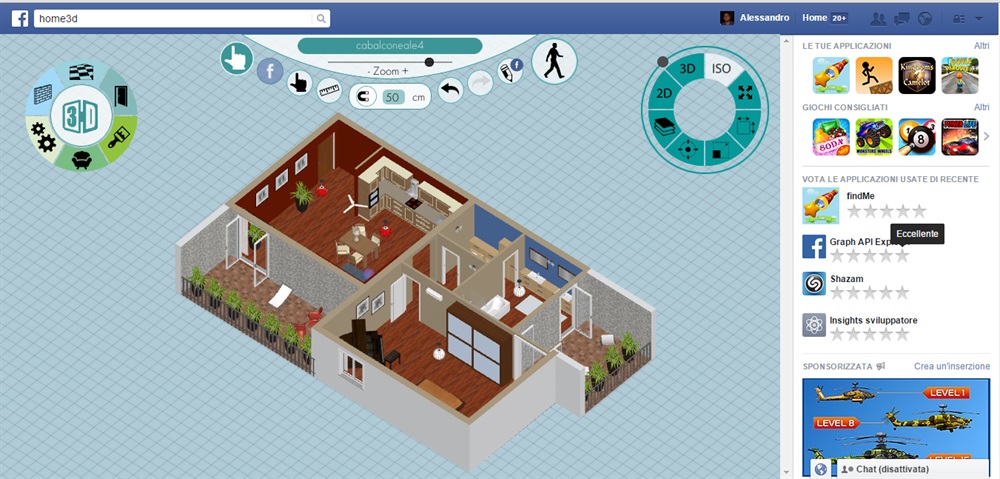 Questo secondo software è un Social Home Planner 3D che permette di disegnare la piantina della propria casa, arredarla o rimodernarla con estrema facilità. In maniera intuitiva e con pochi click, sarà possibile creare una planimetria precisa, scegliere ed inserire le finiture ed i migliori arredi dai cataloghi dei principali produttori e venditori del mondo; grazie alla navigazione 3D, si potrà poi esplorare ogni angolo, sembrerà di camminare all’interno della propria visione. Infine, essendo una Facebook App, Home 3D permetterà di condividere il progetto con i propri amici, in modo da cooperare per realizzare qualcosa di esclusivo e davvero perfetto.