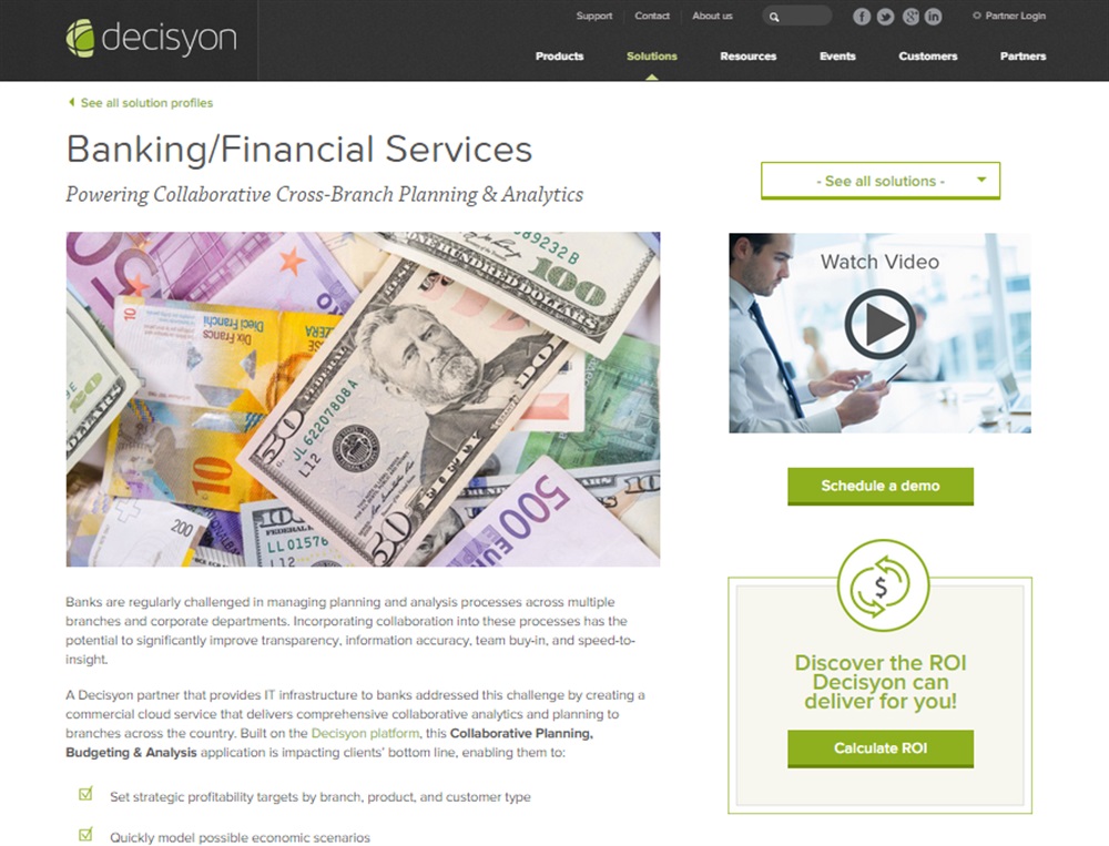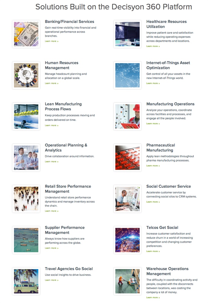 Le pagine della Solutions Gallery dedicate alle diverse soluzioni offerte da Decisyon includono uno strumento di calcolo per il ROI, dimostrazioni video, casi di studio sui clienti, white paper e altre informazioni volte ad assistere i business manager e i dirigenti IT nel trovare soluzioni alle loro sfide imprenditoriali e nel modellare i vantaggi che queste soluzioni possono portare alle loro imprese. I clienti che hanno implementato le soluzioni di Decisyon hanno riscontrato benefici significativi tra i quali: