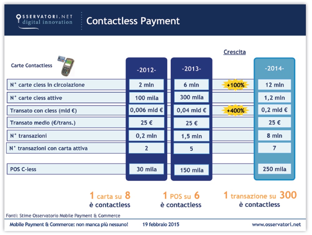 L’infrastruttura contactless è, infatti, cresciuta nel 2014: 1 carta su 8 è contactless (si stimano 12 milioni di carte a fine 2014, raddoppiate rispetto al 2013) e 1,2 milioni (pari al 10% del totale) sono le carte attive (hanno effettuato almeno una transazione in modalità senza contatto); 1 POS su 6 è attivo in modalità contactless (250.000 a fine 2014, +67% rispetto al 2013). Tuttavia solo 1 transazione su 300 di quelle con carta è contactless, per un transato complessivo pari a circa 200 milioni di euro. È un risultato ancora limitato, ma in forte crescita rispetto al 2013 (cinque volte in più), grazie anche agli sforzi messi in atto dagli esercenti che, con l’aiuto dei circuiti e degli acquirer, hanno fatto alcune azioni per abituare il cliente a questo tipo di pagamenti (ad esempio girando il POS verso il cliente ed invitandolo a svolgere il pagamento in autonomia).