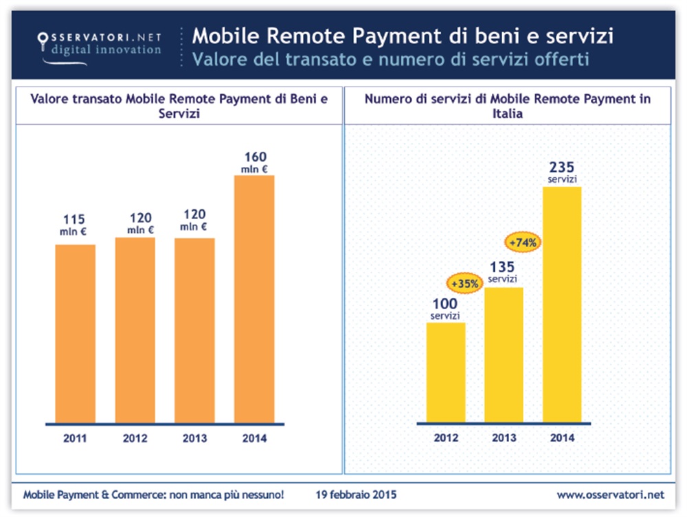 In Italia il Mobile Payment & Commerce da remoto, attraverso le app del proprio smartphone, si sta diffondendo rapidamente: vale circa 2 miliardi di euro nel 2014 e si prevede varrà tra 4 e 5 miliardi di euro nel 2017.