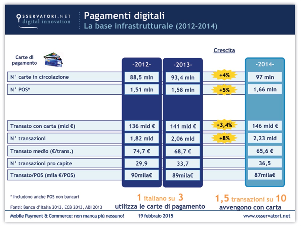 I pagamenti digitali in Italia crescono del 3,6% nel 2014 nonostante la riduzione dei consumi.