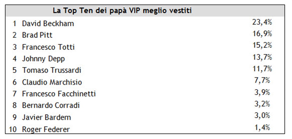 David Beckham si aggiudica lo scettro della classifica dei papà più glamour. Le italiane con il 23,4% delle preferenze eleggono infatti sul gradino più alto del podio il bel papà inglese, che alla carriera calcistica ha alternato in diverse occasioni quella di modello e testimonial per diversi brand della moda e del lusso. Alle sue spalle al secondo posto della top ten dei papà meglio vestiti con il 16,9% dei voti si piazza il biondo attore hollywoodiano Brad Pitt, papà amorevole ritratto più volte in compagnia dei numerosi figli e della moglie Angelina Jolie. Si aggiudica invece il terzo gradino del podio l’italianissimo Francesco Totti, il capitano della Roma raccoglie infatti il 15,2% delle preferenze. A scendere nella top ten dei papà più apprezzati in fatto di look, le intervistate da Showroomprive.it mettono al quarto posto Johnny Depp, attore poliedrico che si contraddistingue per il suo stile sempre particolare e personalissimo. Al quinto posto si posiziona il sempre elegantissimo Tomaso Trussardi seguito da un altro papà del mondo dello sport, il calciatore Claudio Marchisio. In settima posizione troviamo poi Francesco Facchinetti tallonato a poca distanza da Bernardo Corradi. Chiudono la classifica altri due papà famosissimi: l’attore Javier Bardem e la star del tennis Roger Federer rispettivamente al nono e decimo posto.