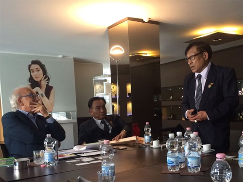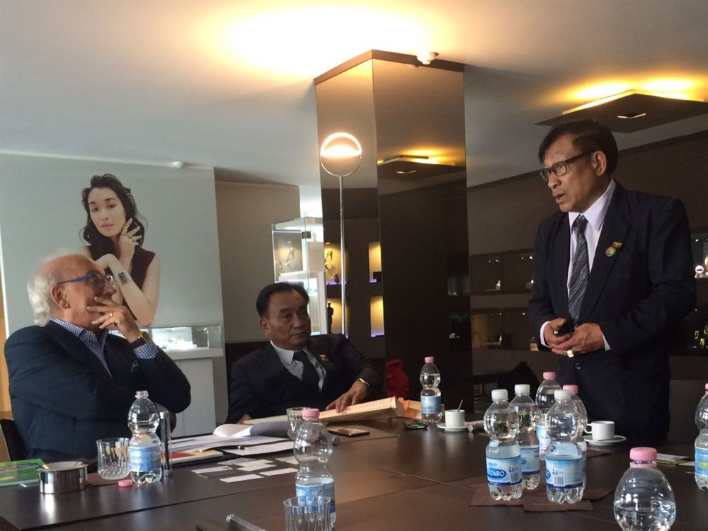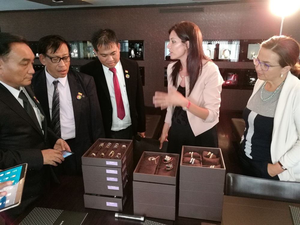 Hanno avuto l’opportunità di incontrare Roberto Coin, proprietario di una tra le più importanti aziende italiane nel settore della gioielleria: la Roperto Coin SpA. Roberto Coin è particolarmente noto per i principi riguardanti la responsabilità sociale d’impresa, in termini di tracciabilità dell’estrazione. La discussione è stata incentrata sui metodi di taglio e su corsi di formazione, con lo scopo di dare la possibilità ai tagliatori del Myanmar di entrare in contatto con lo stile italiano. La delegazione ha anche avuto la possibilità di visitare la sede de “La quinta stagione”, un’impresa di lavorazione parte del Roberto Coin Group.