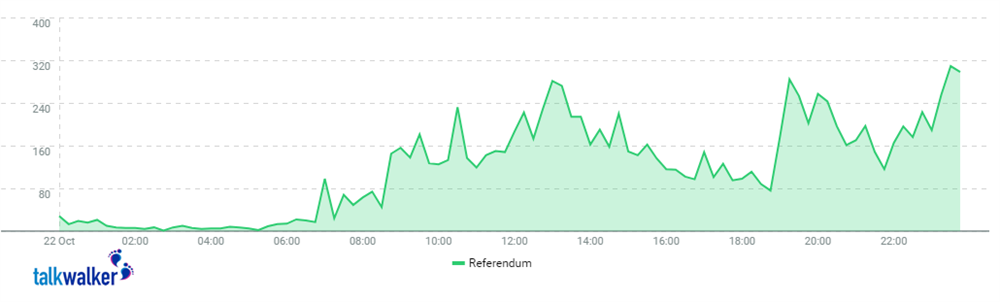 Le discussioni sul tema si sono concentrate proprio nella giornata del referendum (22 ottobre), con le menzioni dei termini “Referendum Autonomia” e l’hashtag #Referendum Autonomia hanno fatto registrare picchi oltre le 300 mention in coincidenza con gli orari di diffusione dei dati di affluenza.