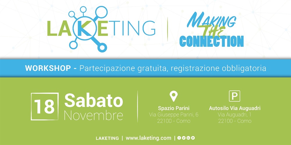 Il primo appuntamento di Laketing sarà un workshop dal titolo Laketing: Making the connection che si svolgerà alle 10:00 di sabato 18 novembre a Como, presso lo Spazio Parini. «Auspichiamo la presenza di molti comaschi, professionisti e non – spiegano i tre promotori del progetto – così come crediamo che la presenza di rappresentanti delle istituzioni e delle associazioni di categoria sarebbe un segnale importantissimo per tutta la città». La partecipazione è gratuita previa registrazione su Eventbrite.