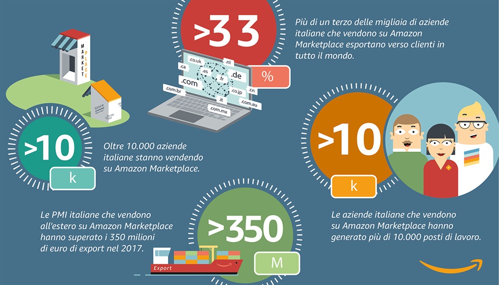 Di conseguenza, nel 2017 le aziende italiane presenti su Amazon Marketplace hanno totalizzato vendite all’estero, in tutto il mondo, per oltre 350 milioni di euro attraverso gli undici siti web di Amazon, in sette lingue diverse, che consentono di raggiungere milioni di potenziali nuovi clienti. La metà di tutte le vendite sui siti Amazon nel mondo è effettuata da aziende indipendenti presenti su Amazon Marketplace; le PMI esportano prodotti verso clienti in Europa, Nord America, Giappone, China e India.