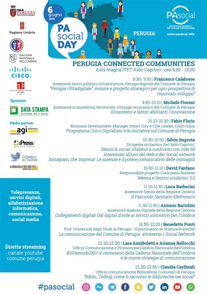 17 eventi #pasocial che a Perugia vedono il coinvolgimento nello stesso tavolo, presso l’aula magna dell’Istituto Tecnico Capitini, del Comune di Perugia, della Regione Umbria, degli studenti dell’istituto Capitini, di Cisco, azienda di origini statunitensi, fortemente orientata all’innovazione tecnologica, dell’Università degli Studi di Perugia e della Galleria Nazionale dell’Umbria che in contemporanea e in diretta web sul canale YouTube del Comune di Perugia tratteranno con diversi livelli di approfondimento molti temi legati alla nuova comunicazione e all’uso dei servizi digitali per i cittadini.