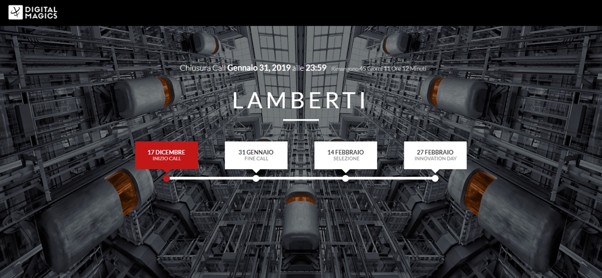 Le startup e PMI innovative, che stanno sviluppando servizi e prodotti per la gestione del magazzino aziendale, potranno inviare il proprio progetto entro il 31 gennaio 2019 su https://openinnovation.digitalmagics.com/it/challenge/lamberti