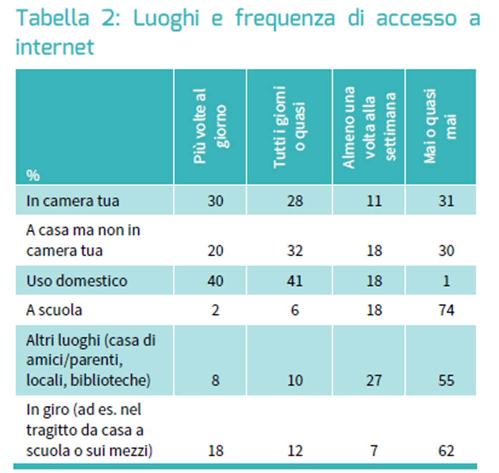 A scuola, invece, solo un ragazzo su quattro afferma di usare internet almeno una volta alla settimana. La forma più comune per gestire l’utilizzo di internet da parte della scuola è la mediazione restrittiva, vale a dire stabilire le regole su cosa si può fare su internet all’interno dell’ambiente scolastico. L’utilizzo dello smartphone è generalmente proibito, ma alcuni istituti stanno iniziando ad introdurre l’uso dei device nelle attività didattiche.