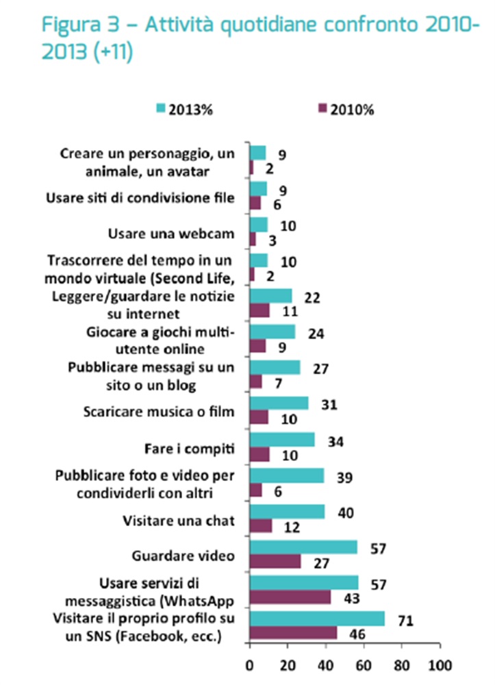 Internet è una risorsa sempre più utilizzata anche nello svolgimento dei compiti. La percentuale dei ragazzi che quotidianamente accedono al web per lo studio è infatti più che triplicata passando dal 10% nel 2010 al 34% nel 2014.