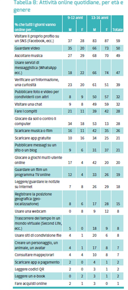 Dalla ricerca Net Children Go Mobile emerge che il 34% dei ragazzi produce e si scambia video e immagini su Whatsapp e Instagram,il 43% dei ragazzi tra i 13 e i 16 anni svolge i propri compiti online. Il 38% dei giovani italiani accedono ad internet con il proprio smartphone