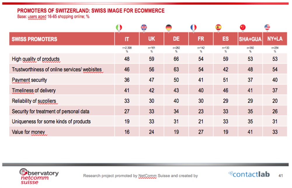 Along with different reasons and approaches depending on the country, Swiss has overall a strong reputation regarding different elements: the high quality of the Swiss product is the first recognized value as for Germany (66% of the respondents) as it is in China (53% in Shanghai+Guangzhou), also Germany links to Swiss products the trust regarding online services (63%) , so does the United Kingdom (56%) and France (54%); the fast delivery is mostly appreciated in Spain (46%) while the security in payments when buying a Swiss product is at the top of Spanish customers’ minds for the 51% of the interviewees.