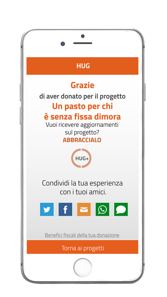 Dono Sicuro, Sicuro di Donare. HUG è uno strumento pensato per avvicinare al mondo delle donazioni anche i giovani, a strettissimo contatto con la tecnologia mobile e sempre più attenti ai risultati ed all’impatto delle proprie azioni. HUG è la risposta a tutte le persone che vogliono contribuire a migliorare la realtà e il mondo che le circonda, ma che non hanno ancora trovato una modalità di donazione adeguata alle loro esigenze.