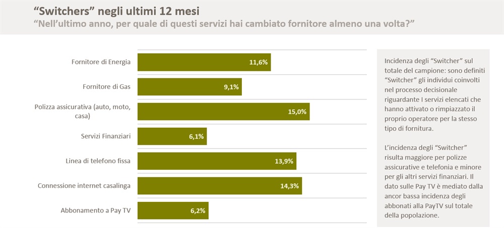 Questo dato diventa rilevante se si considera il passato decennio, durante il quale solamente una percentuale tra il 4 ed il 5% degli italiani era approdato ad un nuovo operatore. La ricerca mostra come nel 2015 un italiano su 10 abbia valutato ed accettato un’offerta più conforme alle proprie esigenze, avvicinandosi alle percentuali di “switch” del mercato delle telecomunicazioni, anche grazie alla crescita dei gruppi d’acquisto.