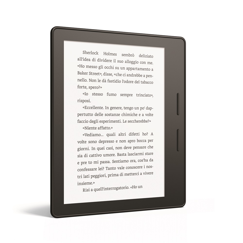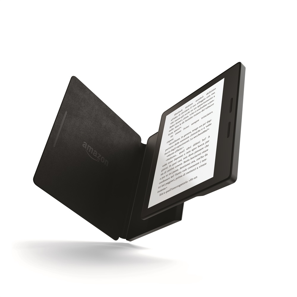 - Kindle Oasis, il Kindle più sottile e più leggero con un design ergonomico innovativo, pulsanti per il cambio di pagina e una custodia in pelle con batteria incorporata che, una volta collegata, fornisce mesi di utilizzo attraverso un unico sistema di caricamento a due batterie, a partire da 289,99€.