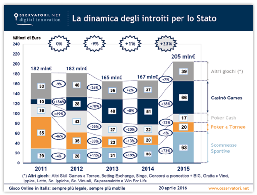 La crescita è dovuta anzitutto ai Casinò Games, cresciuti del 27% nel 2015 e capaci di raggiungere i 328 milioni di euro (pari al 40% del mercato complessivo), e delle Scommesse Sportive, cresciute del 25% ed arrivate a valere 267 milioni di euro (32% del mercato) in un anno in cui peraltro non ci sono state importanti manifestazioni sportive estive. Dall’altro lato prosegue il trend negativo di Poker online (-18%), Bingo e Scommesse Virtuali (-7% per entrambe). Crescono così anche gli introiti per lo Sato derivanti dai giochi online: +23%, per un valore totale di 205 milioni di €.