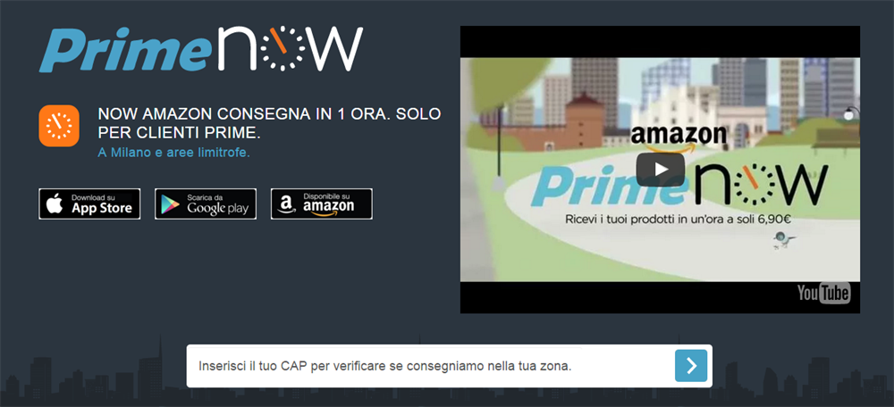 L’app Prime Now è disponibile per i dispositivi iOS e Android. La consegna in un’ora con Prime Now è disponibile per i CAP raggiunti da questa modalità di consegna al costo di 6,90 euro; non sono invece previste spese di spedizione scegliendo di ricevere il proprio ordine in finestre di due ore. E’ possibile verificare i CAP coperti dal servizio Prime Now e dalla consegna in un’ora tramite l’applicazione. Il servizio Prime Now è attivo dalle 8 di mattina a mezzanotte, sette giorni su sette. L’importo minimo per gli ordini Prime Now è 19 euro.